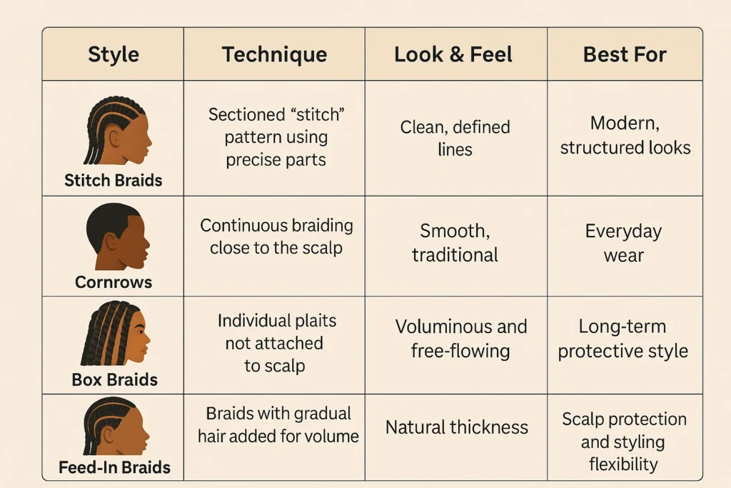 This article is for informational and educational purposes only. The content reflects general professional hair-care practices and cultural insights shared by experienced braiders. Individual results may vary based on hair type, stylist technique, and maintenance routine. Always consult a licensed stylist or professional braider for personalized advice before attempting or installing stitch braids.